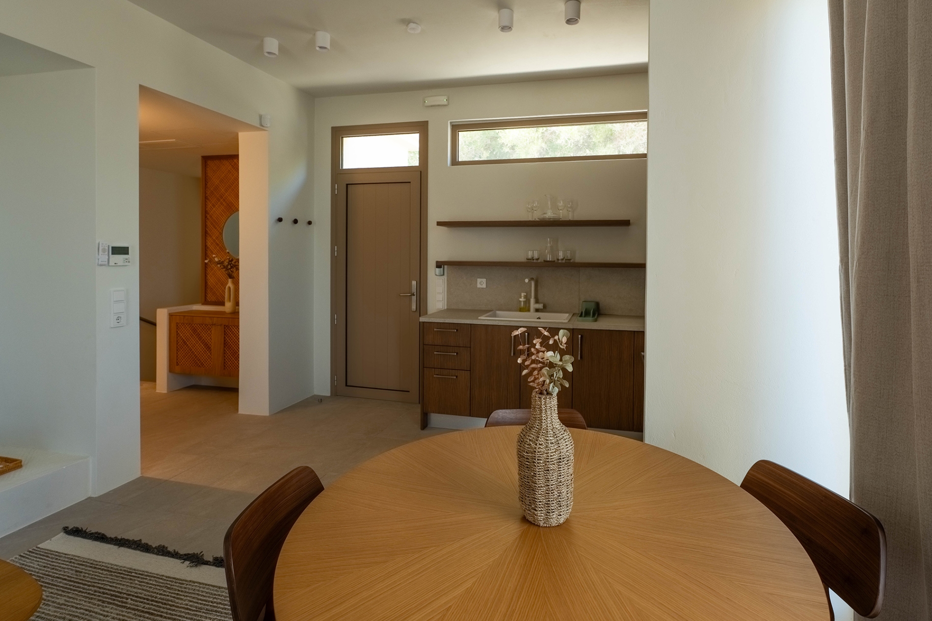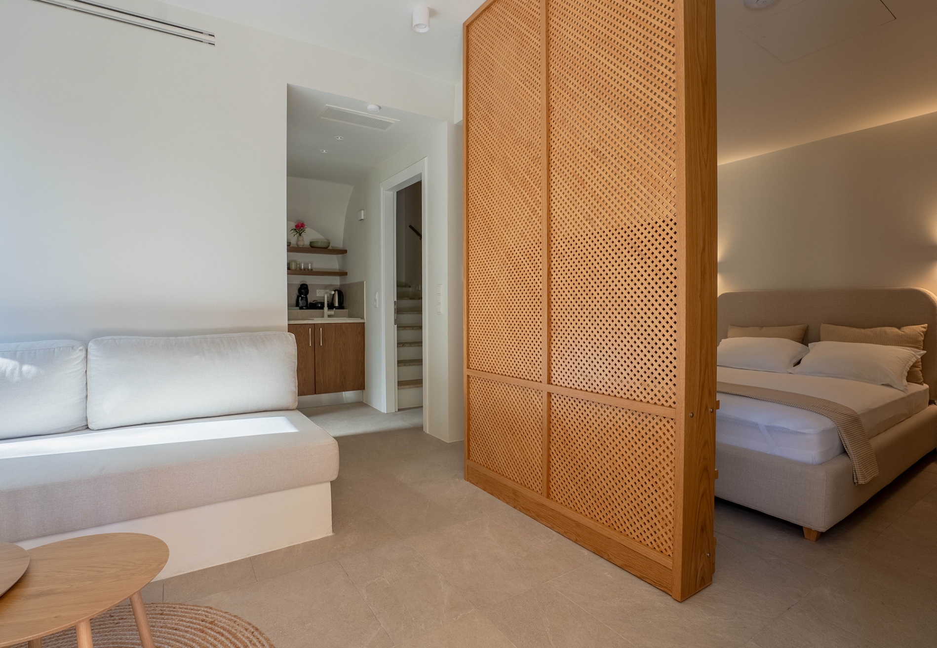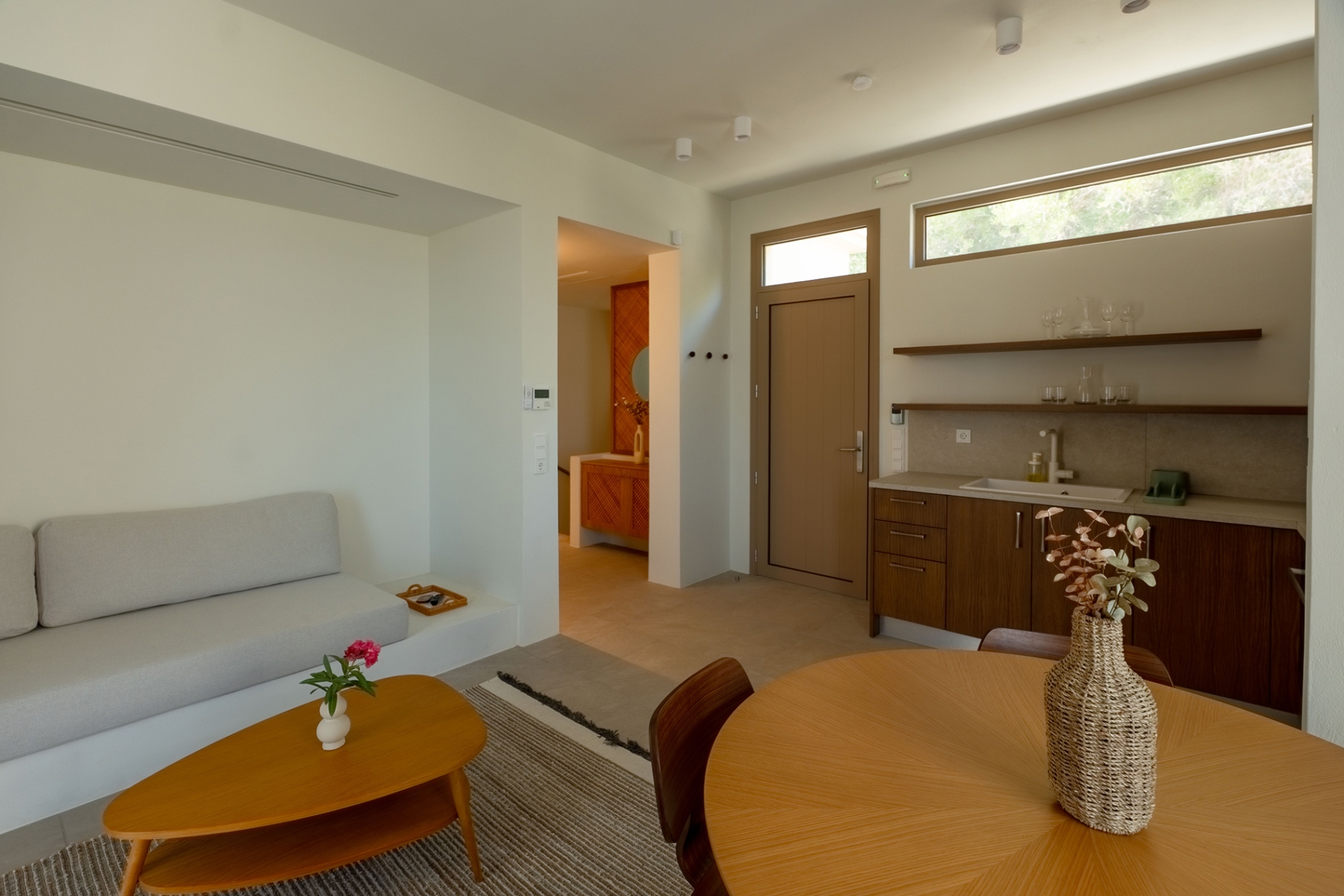 To ισόγειο είναι ένα ενιαίο στούντιο κι έχει άμεση πρόσβαση στον κήπο και την πισίνα. Διαθέτει ένα διπλό κρεβάτι, ντουλάπες, ένα χτιστό καναπέ μονού στρώματος στο σαλονάκι, ένα πλήρως εξοπλισμένο κουζινάκι και ένα μπάνιο με ντουζιέρα. Στον εξωτερικό χώρο υπάρχει χτιστός καναπές και βλέπει στον κήπο.