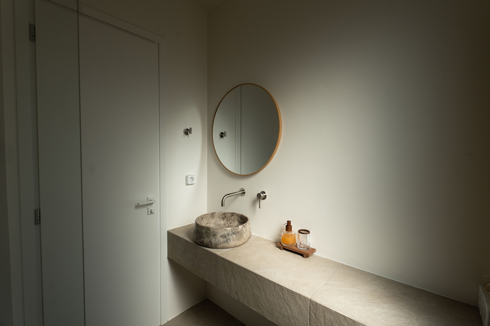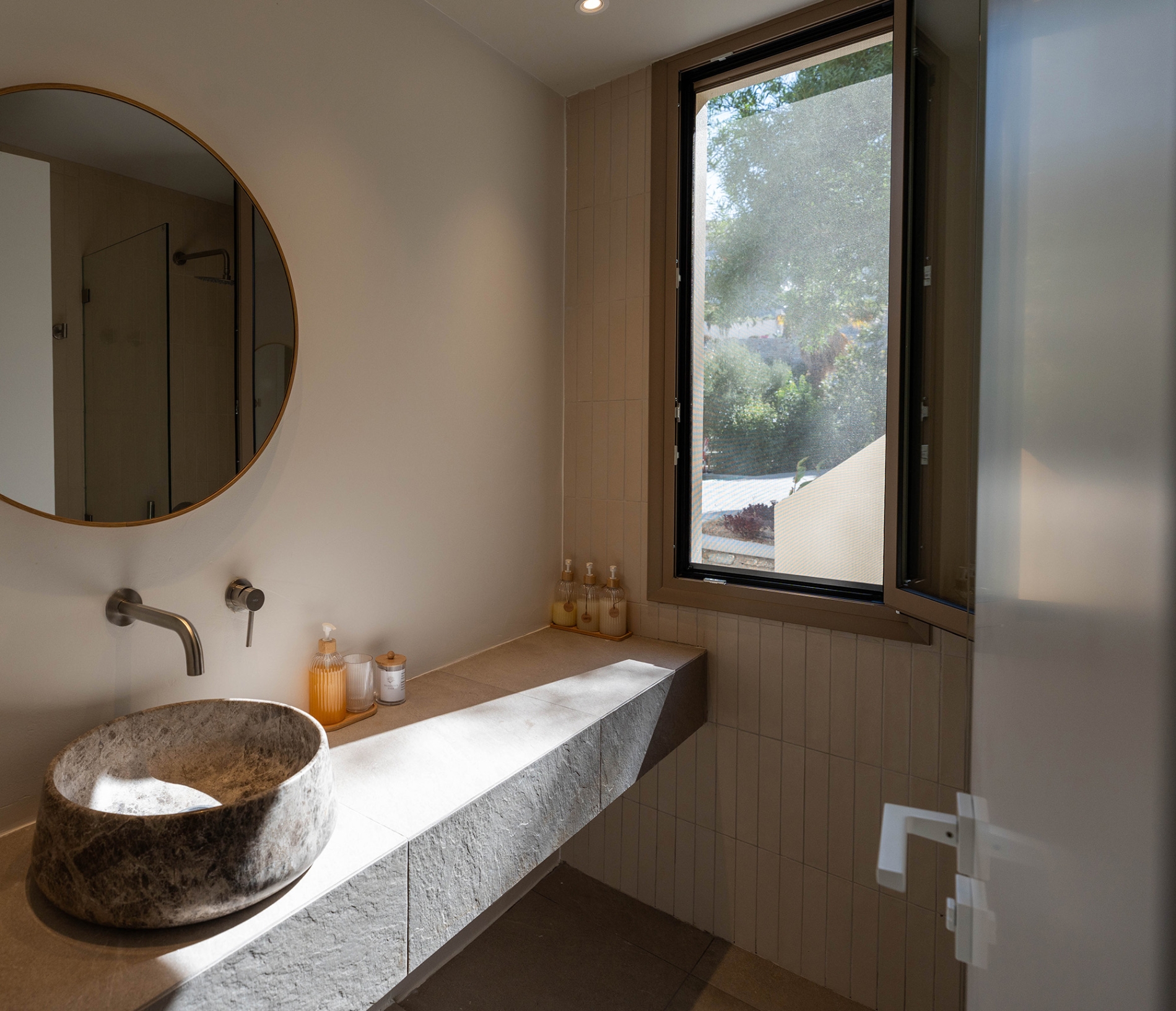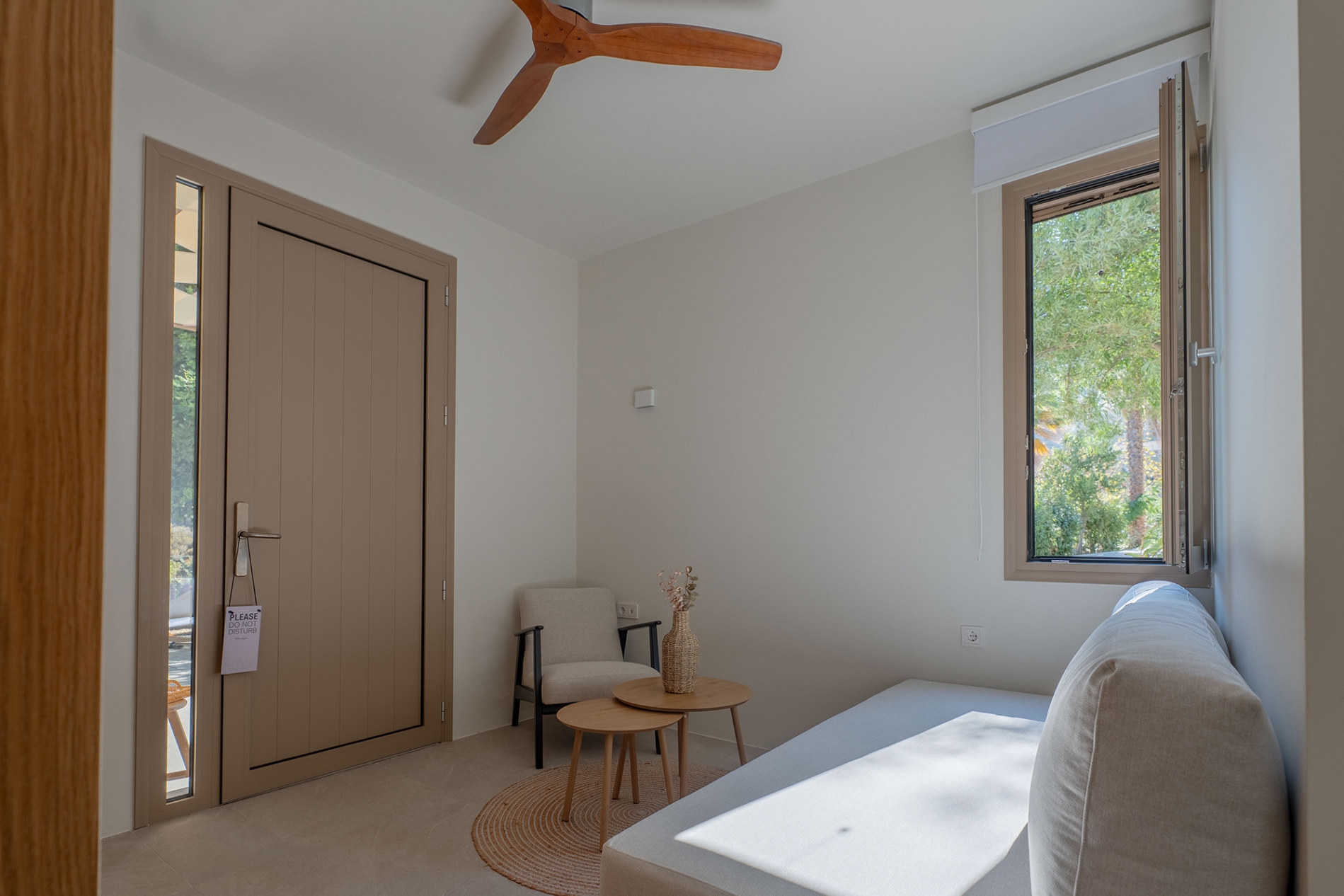 To ισόγειο είναι ένα ενιαίο στούντιο κι έχει άμεση πρόσβαση στον κήπο και την πισίνα. Διαθέτει ένα διπλό κρεβάτι, ντουλάπες, ένα χτιστό καναπέ μονού στρώματος στο σαλονάκι, ένα πλήρως εξοπλισμένο κουζινάκι και ένα μπάνιο με ντουζιέρα. Στον εξωτερικό χώρο υπάρχει χτιστός καναπές και βλέπει στον κήπο.