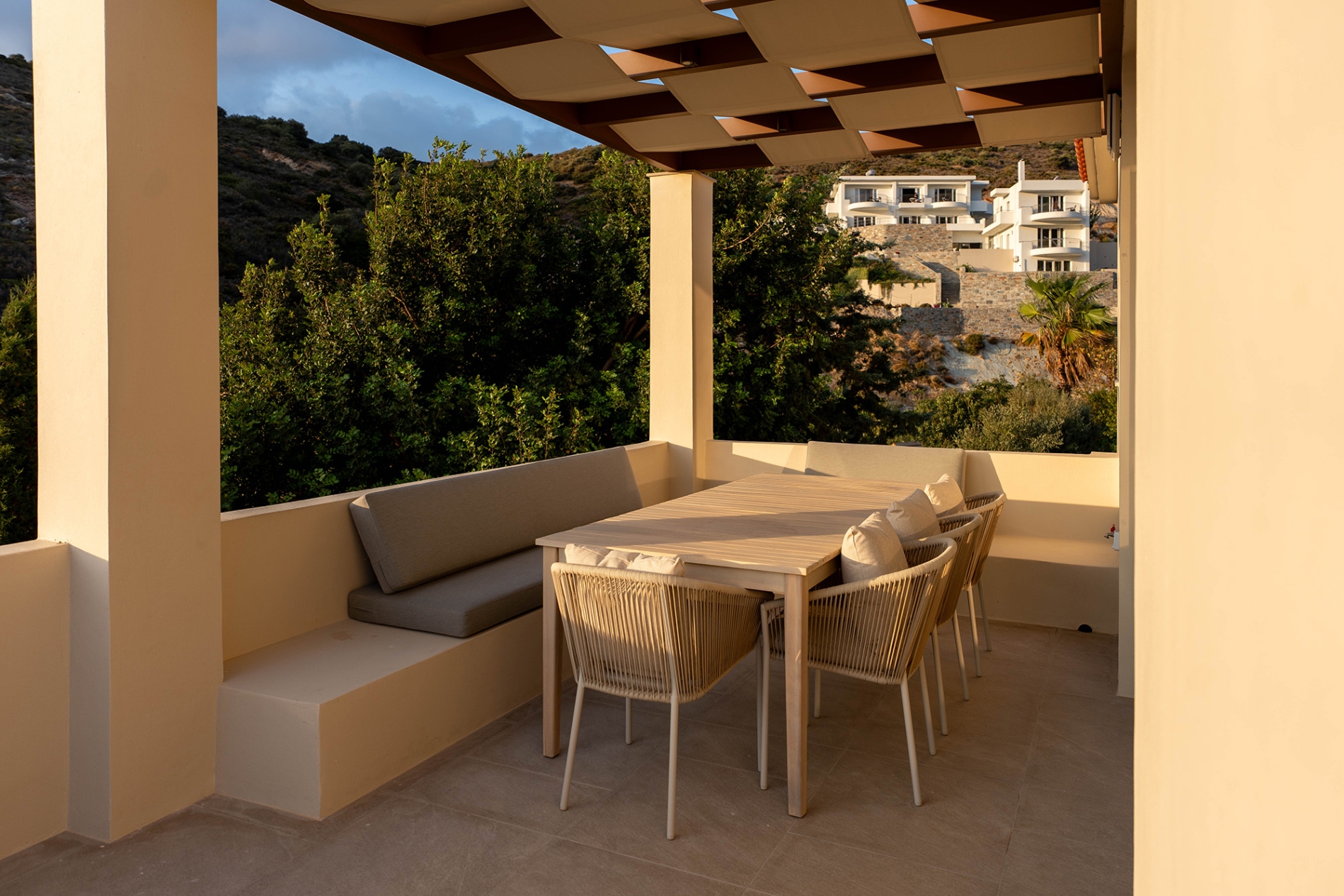 Στον πρώτο όροφο υπάρχει μια κρεβατοκάμαρα με διπλό κρεβάτι, ντουλάπα και γραφείο, ένα μπάνιο με ντουζιέρα και ενιαία πλήρως εξοπλισμένη κουζίνα με τραπεζαρία και καθιστικό με μεγάλο χτιστό καναπέ. Στη βεράντα υπάρχει τραπεζαρία 8 ατόμων και μεγάλο καθιστικό με απεριόριστη θέα θάλασσα. Ο πρώτος όροφος διαθέτει ιδιωτική είσοδο και πρόσβαση στον κήπο και την πισίνα τόσο από εξωτερική σκάλα όσο και από την εσωτερική σκάλα, εφόσον χρησιμοποιείται ως ενιαία μεζονέτα.